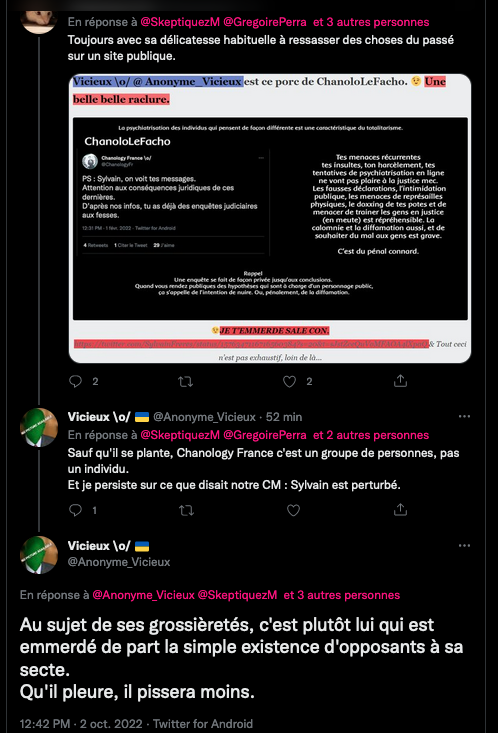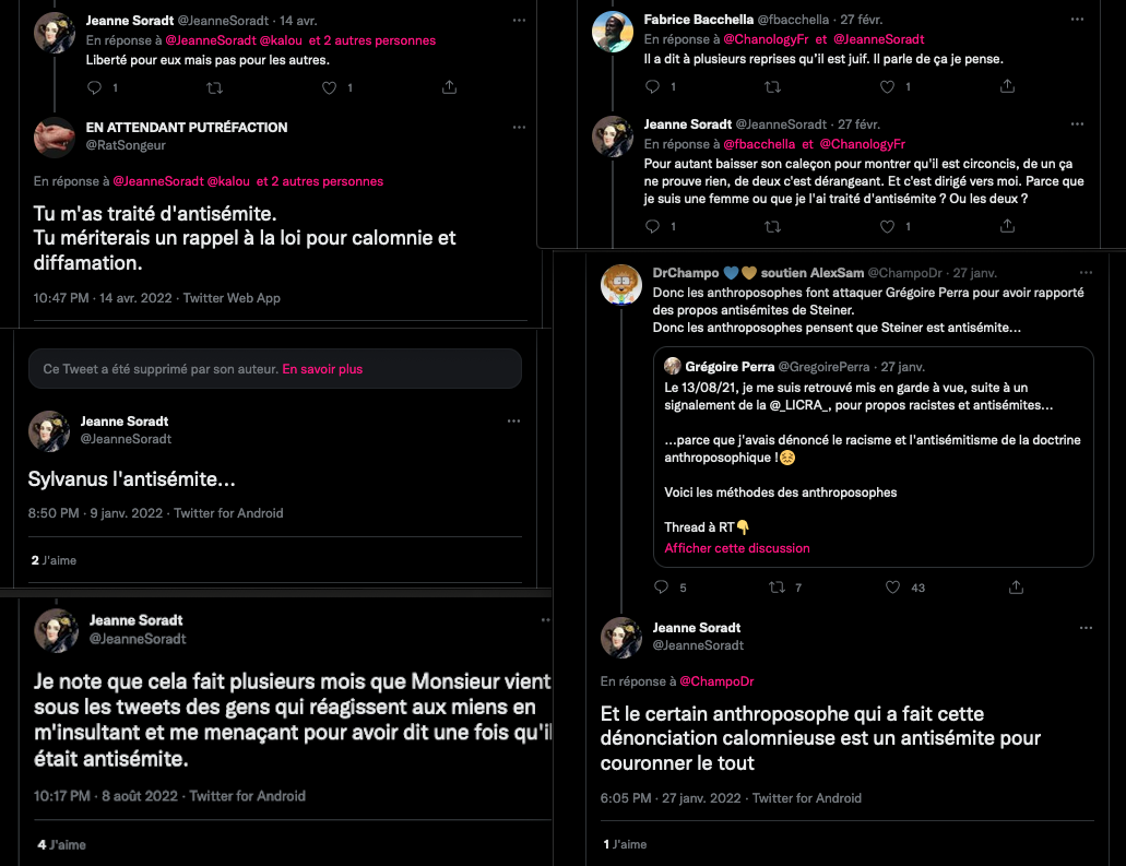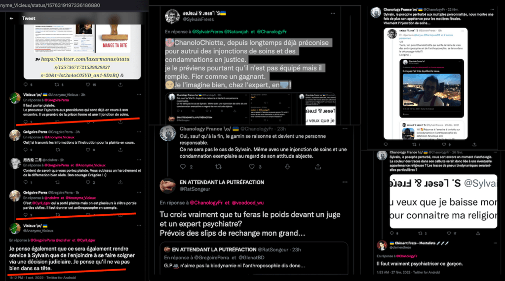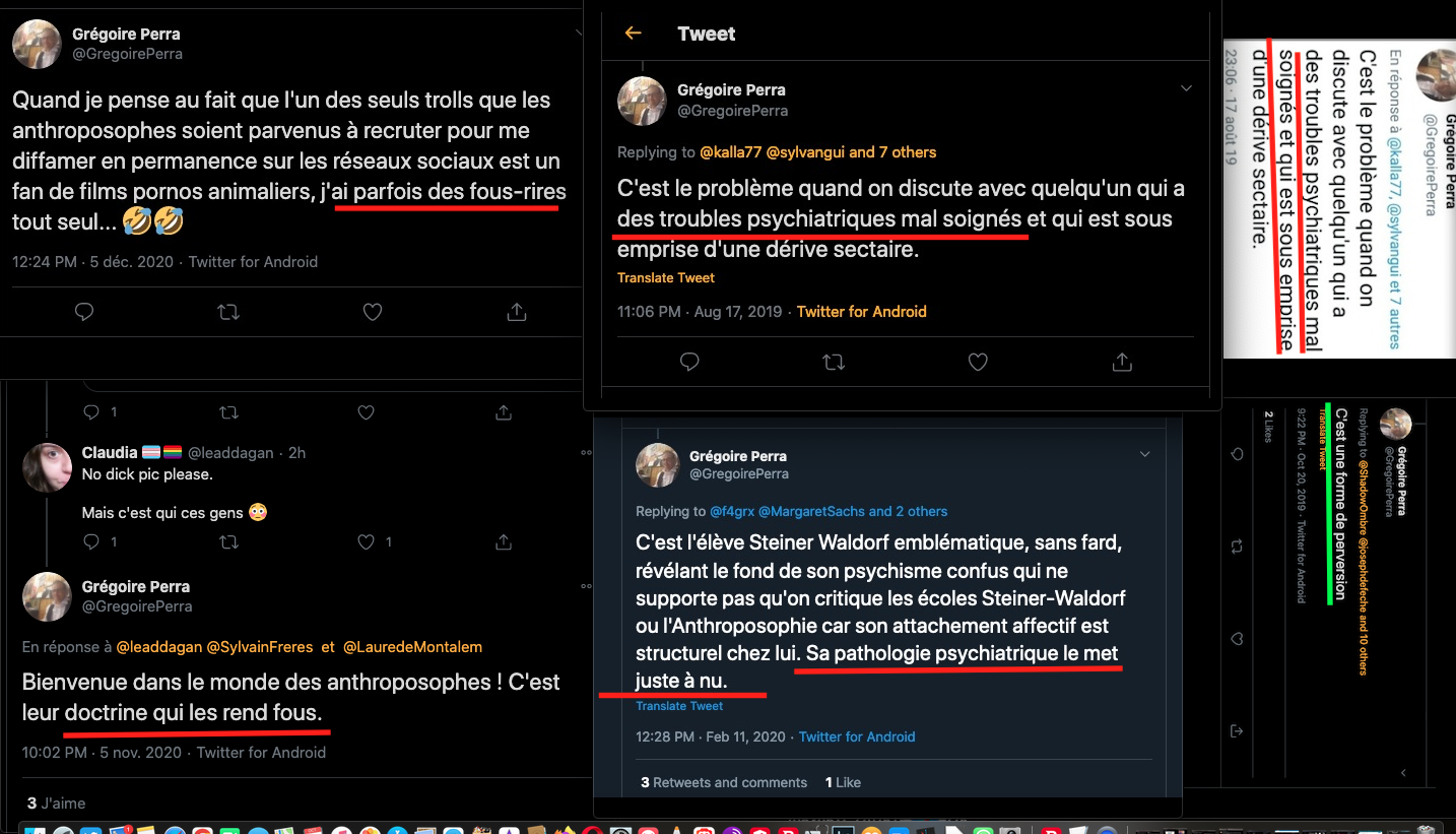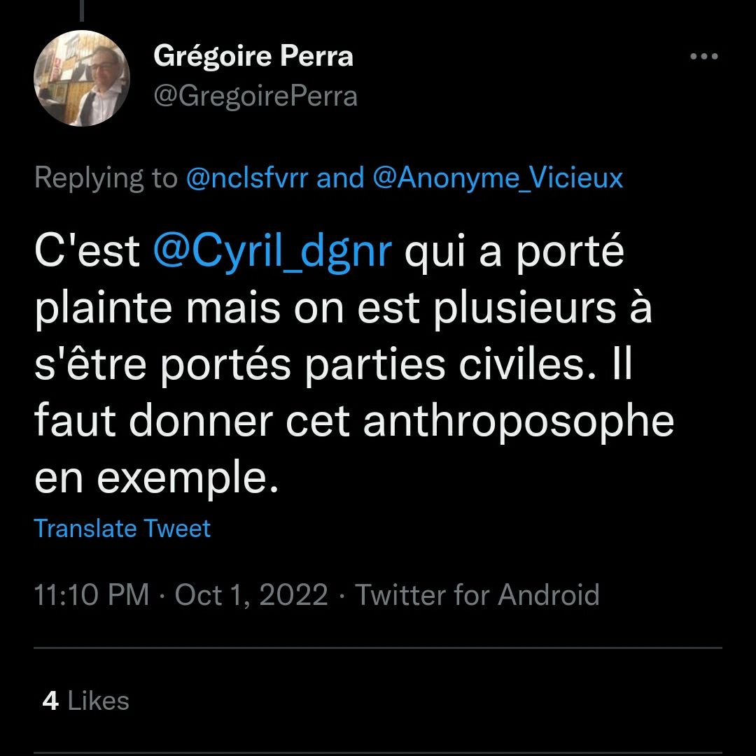 Lire : https://lamehumaine.com/2022/08/30/les-milice-z-et-consorts-anti-anthroposophes-anthroposophie-de-la-rentree/… Perra est adepte d’encourager les menaces à mon encontre, certaines sont gravissimes : https://twitter.com/Zobologue/status/1516831993920880640?s=20&t=h6bQeLS7lRJQpbkmqqIODA & https://twitter.com/LaFactur/status/1389145997566259201?s=20&t=EEBmsWS03WFRAAL-tFwH8A (non exhaustif.)