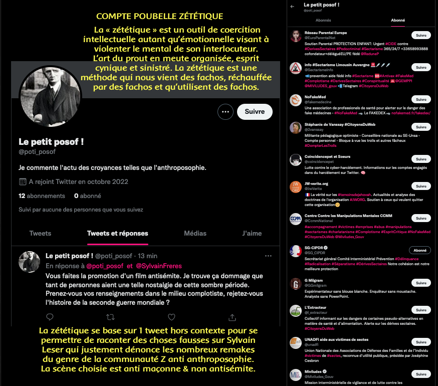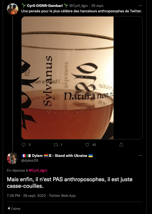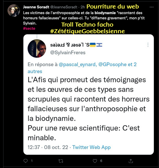 🇫🇷DES AMIS À VOUS? https://twitter.com/ArchibaldMcEnd/status/1577760298630610944?s=20&t=fq5QStVfOY6U-g28hUOP0Q & https://twitter.com/ArchibaldMcEnd/status/1577763128561045510?s=20&t=AIjA0_hEI7PwsRAgbY9GLQ 1/3 Cette personne obsessionnelle se la raconte et se livre à du harcèlement diffamatoire relou envers un jeune prof qui aurait tort selon elle, de défendre l’anthroposophie et la biodynamie. https://twitter.com/SylvainFreres/status/1577765657931878420?s=20&t=dcTxQ9hvNLKSA1_UDTkkBQ & https://twitter.com/SylvainFreres/status/1577907067133853696?s=20&t=6EKNLxvhQBcZY6h4GTseHw… Et, @kakaDeNazi c’est votre pote aussi? ⤦