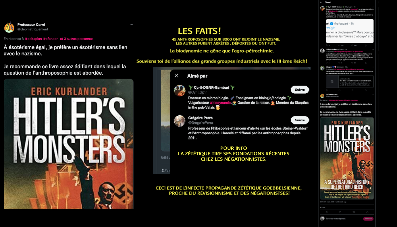 _ 1/2 Les anti anthroposophes, biodynamie tentent inlassablement de faire passer autrui pour ce qu’ils sont eux viscéralement. Ce tweet visait à dénoncer la similarité entre la propagande zététique avec celle des nazis à l’encontre de l’anthroposophie ! https://twitter.com/SylvainFreres/status/1578822393111646208?s=20&t=xZOynBY6oMPecAnXdn85NA &