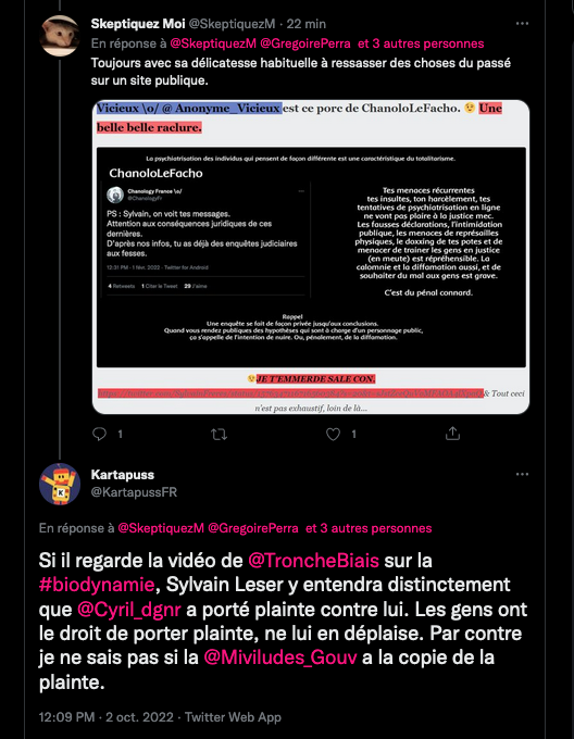 ⚖️Ton pote qui se réjouit de me foutre sur les rails, car je défends l’anthroposophie et la biodynamie, tu crois que le justice va en penser quoi? https://twitter.com/SylvainFreres/status/1576826629355339776?s=20&t=sQ9qrPL9pd0uHElxokMPww & Tu crois sérieusement à ce que tu racontes là? C’est d’ailleurs une menace et de la calomnie. L’acharnement à lieu contre moi, et ce depuis des mois & à l’inverse de vous, je peux le prouver. Défendre l’anthroposophie est dangereux face aux fanatiques https://twitter.com/SylvainFreres/status/1576826119638040581?s=20&t=sQ9qrPL9pd0uHElxokMPww