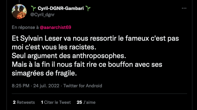 Gambari, activiste malsain, anti biodynamie anthroposophie se plaint qu’ensuite des personnes lui répondent et va chouiner auprès du GVT car il ne se sent pas soutenu, laule.