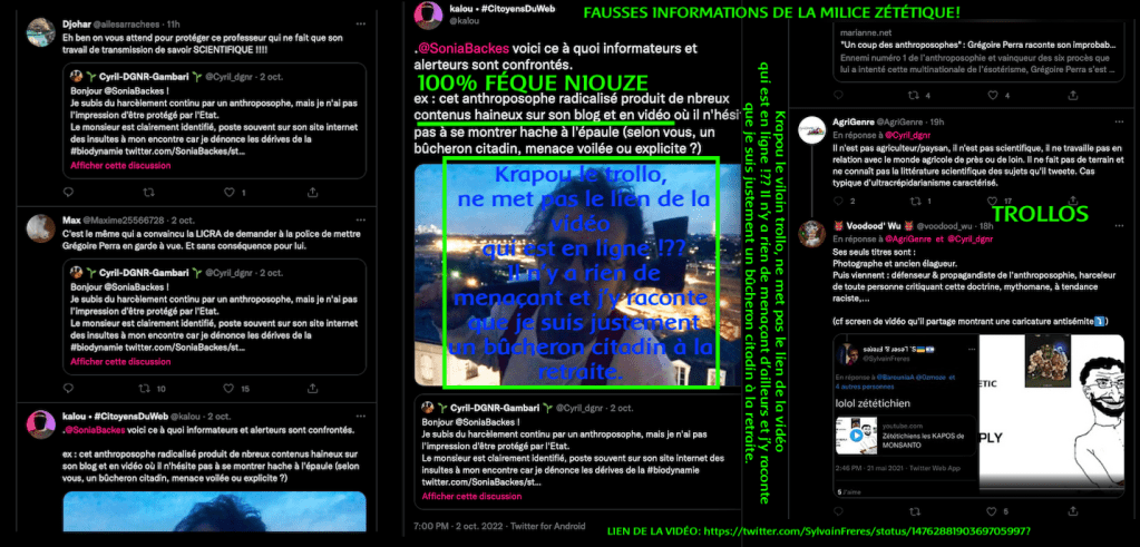 Qu’allez vous faire à l’encontre de la secte zététique qui trafique, fabrique des faux signalements à l’encontre de personnes qui osent défendre l’anthroposophie, la biodynamie? Comme Krapou qui raconte des choses fausses: https://twitter.com/SylvainFreres/status/1576633070765379584?s=20&t=_l7vnRdOd8CWtwJlHqMbsg & Ils se font passer pour des victimes mais les faits sont ailleurs, ce sont eux qui harcèlent et menacent en permanence. La zététique anti anthroposophie biodynamie et pas que, est une dérive sectaire. https://twitter.com/SylvainFreres/status/1576634297989025792?s=20&t=_l7vnRdOd8CWtwJlHqMbsg & Qu’allez vous faire à l’encontre de la secte zététique qui trafique, fabrique des faux signalements à l’encontre de personnes qui osent défendre l’anthroposophie, la biodynamie? Tout ce que raconte Kalou est bidouillé. https://twitter.com/SylvainFreres/status/1576635092289880064?s=20&t=_l7vnRdOd8CWtwJlHqMbsg