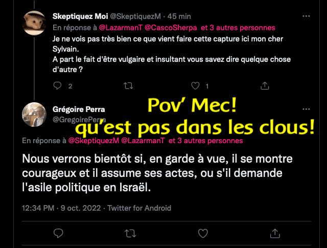 _ Un coup il fait des menaces débiles: https://twitter.com/SylvainFreres/status/1579072328612597760?s=20&t=_f2xwnXXdZhZbIC6a9wVng