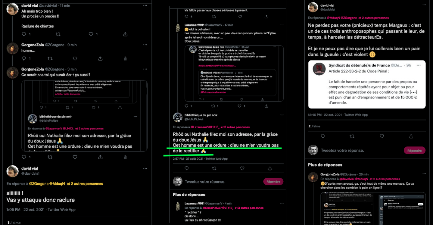 Si j’ai continué ces jours-ci, bien que j’ai tenté d’annoncer proprement mon départ, c’est que ces types semblent avoir envie de continuer de me bastonner et lyncher en ligne, tant que ça reste en ligne c’est pas bien grave me direz-vous mais tout le monde sait bien qu’après l’ensauvagement des mots vient celui des actes et je ne me laisserai pas intimider par des petits voyous du web qui pètent plus haut que leur cul. Lorsqu’ils auront arrêté de me relancer et de remettre des pièces en m’interpellant, me citant, je laisserai ces connards se démerder avec les connards d’en face, car je pense à force que les anthroposophes qui ne se défendent pas publiquement le font exprès, que ça fait parler d’eux et qu’ils s’économisent un débat publique, ce qui leur a d’ailleurs été reproché.