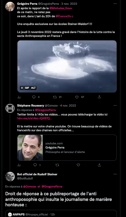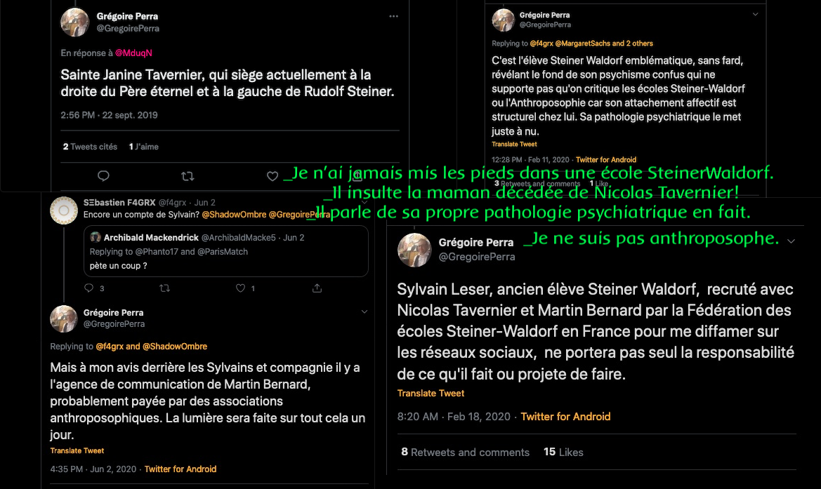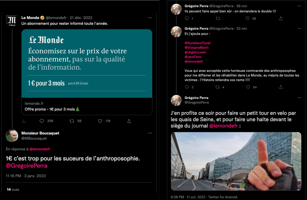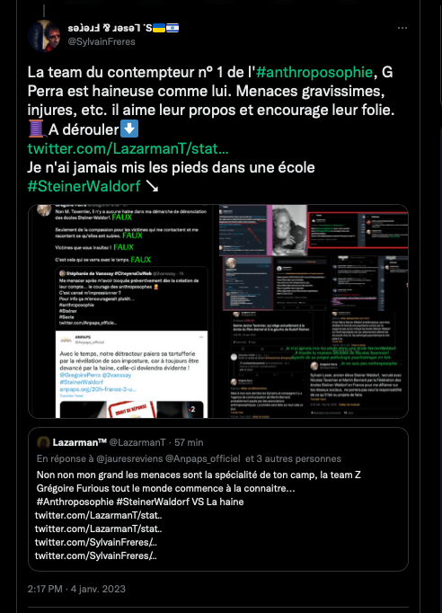 , ils le font savoir à l’année. « Il est dans tous les bons coups G Perra »…. https://twitter.com/SylvainFreres/status/1610595918478188545?s=20&t=rW-r4sOaH1Vb06ukAYetGA ___________ Grégoire Perra l’anti anthroposophes et ses sbires n’aiment pas le journal Le Monde #LeMondeGate https://twitter.com/LazarmanT/status/1610602109296148481?s=20&t=OztGvyOGIMPloXK3TfRNIQ _____________________. _ Sa copine anti anthroposophes c’est pas mieux, et elle couine comme quoi elle est bloquée https://twitter.com/SylvainFreres/status/1556674973472882688?s=20&t=vu-fRIXfpQqoOsT8sohz4Q… https://twitter.com/SylvainFreres/status/1551647399915003905?s=20&t=UOw_JmPc_rWkcd0fvRHMRA… https://twitter.com/LazarmanT/status/1586056224780320769?s=20&t=4kk2rDyVsoWh8LW5UrqDaw… https://twitter.com/SylvainFreres/status/1551946795433037826?s=20&t=AO6JIKHKHTzfmD9m_-I2KA… https://twitter.com/SylvainFreres/status/1419679613849067522?s=20&t=OznvTNLTJltnygiQ8O49AA, https://twitter.com/SylvainFreres/status/1551163881862709248?s=20&t=uW-FRGEsyalBUQvc8G4pIg : https://twitter.com/LazarmanT/status/1610607174555779072?s=20&t=uW-FRGEsyalBUQvc8G4pIg