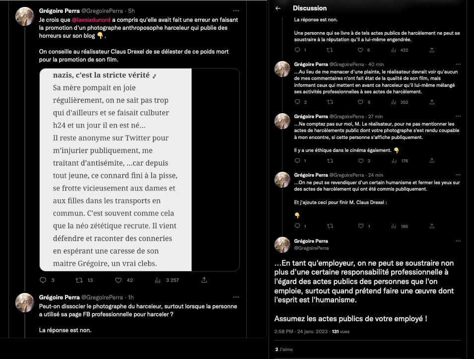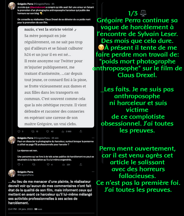 🩲Grégoire Perra🩲 (tripoteur d’étudiante)continue sa vague de harcèlement à l’encontre de Sylvain Leser. Des mois que cela dure. 😏À présent il tente de me faire perdre mon travail de: « poids mort photographe anthroposophe » sur le film de Claus Drexel.