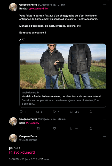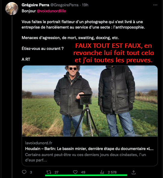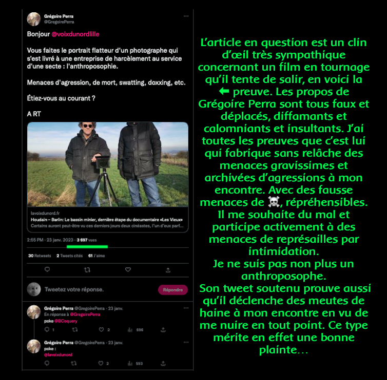 @lavoixdunord Ses allégations sont toutes fausses et je peux le prouver facilement. Lui, en revanche me souhaite du mal, menaces avérées! _https://twitter.com/LaFactur/status/1375182679507931136?s=20&t=Ws8CjuyhayKxc4CbfAiIhQ… _ https://twitter.com/SylvainFreres/status/1516818810174595086?s=20&t=O34oMhFFVF253BiD-FWUCA & https://twitter.com/SylvainFreres/status/1617530306160128003?s=20&t=O34oMhFFVF253BiD-FWUCA & N’oubliez pas à qui vous avez affaire, ce type a été lourdé des écoles #SteinerWaldorf suite à des attouchements sur une étudiante, depuis il l’a mauvaise. C’est souvent le cas avec les pervers. Depuis, il gesticule, harcelant les gens… https://twitter.com/SylvainFreres/status/1617531844521775105?s=20&t=O34oMhFFVF253BiD-FWUCA & Quelques frasques non exhaustives de GP et ses amis de la zététique (secte techno facho). Ce type est un danger public. https://twitter.com/SylvainFreres/status/1617536041895723008?s=20&t=ueOIlI7rir0nLe2lxwFcbw… https://twitter.com/SylvainFreres/status/1617535567159496706?s=20&t=ueOIlI7rir0nLe2lxwFcbw… https://twitter.com/SylvainFreres/status/1617534804592836610?s=20&t=ueOIlI7rir0nLe2lxwFcbw https://twitter.com/SylvainFreres/status/1617533972220706816?s=20&t=O34oMhFFVF253BiD-FWUCA &