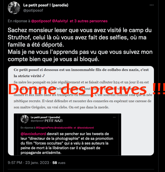 « Grégoire Perra mérite une plainte pour calomnie, diffamation et harcèlement. Ses allégations sont toutes fausses et je peux le prouver facilement. Lui, en revanche me souhaite du mal, menaces avérées! Sylvain Leser » https://twitter.com/SylvainFreres/status/1617530306160128003?s=20&t=TqsAzPp_YyvKw6_TvfTv1w : https://twitter.com/SylvainFreres/status/1617822654475685888?s=20&t=qvCLegE8szoBpe8GSwu4LA