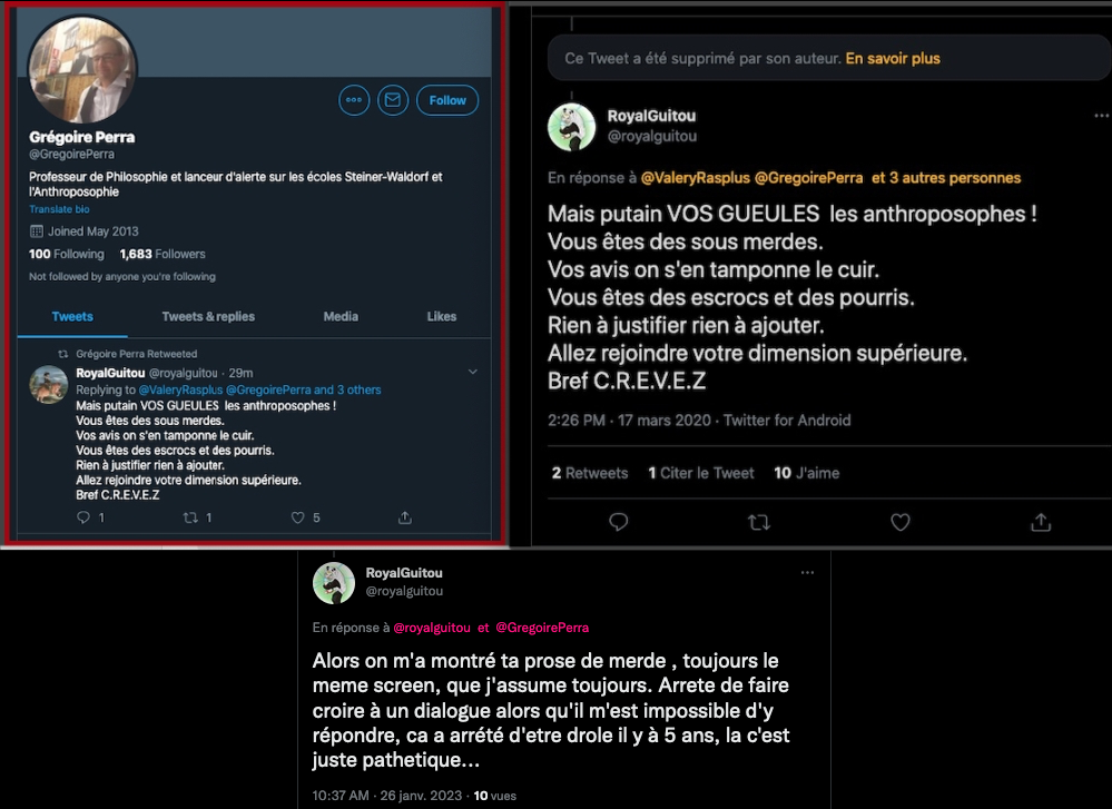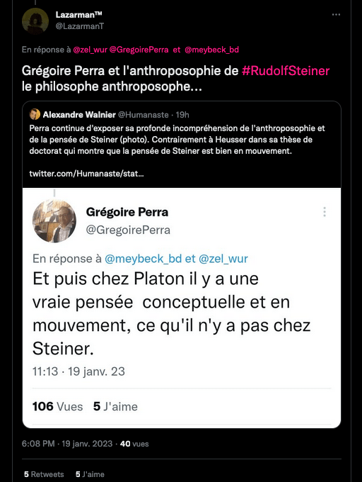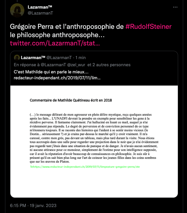🧵_ Bonne chance Grèg! https://twitter.com/LazarmanT/status/1617831375717171206?s=20&t=hC2aWL6x_JhmfPcNRU2GfQ & Lire les frasques de Grégoire Perra sur cet article empilage, et remontez dans le temps, vous y découvrirez pourquoi il s’est fait lourder des écoles Steiner, c’est moche. Depuis, il hurle et harcèle les gens et voit des anthroposophes partout, tel un fou. https://twitter.com/LazarmanT/status/1617832163952726018?s=20&t=hC2aWL6x_JhmfPcNRU2GfQ