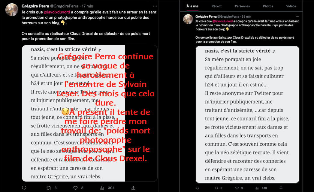 Grégoire Perra déclenche 1 meute haineuse à l’encontre de Sylvain Leser pour lui faire perdre son travail en donnant ses conseils de merde au réalisateur d’un film que je suis en train de tourner. Je n’oublie pas qu’il diffame & me calomnie au passage!