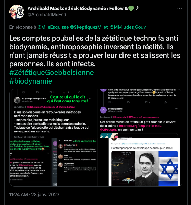 _ Les zététiciens sont bien pires que des racialistes lorsqu’il s’agit de la biodynamie et de l’anthroposophie. Ils sortent leur trollos racistes, homophobes, psychophobes et antisémites… On se croirait chez IG-Farben https://twitter.com/RatSongeur/status/1615443202462613504?s=20&t=vY-TzhVBBS4AoYhC8_4bbg