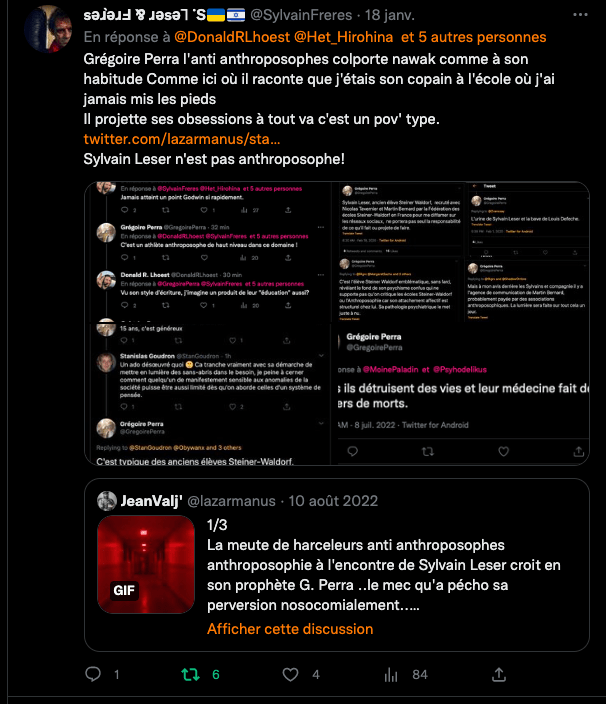 🧵_4 _1/2 Grégoire Perra, contempteur haineux de tout ce qui touche à l’anthroposophie, récidive obsessionnellement à l’encontre de Sylvain Leser et veut lui faire perdre son travail d’artiste! Bonne chance Grèg! https://twitter.com/SylvainFreres/status/1617822661727617025?s=20&t=xzmZSB_h3ktNOI2C03yKfQ… https://twitter.com/SylvainFreres/status/1617822657709498370?s=20&t=xzmZSB_h3ktNOI2C03yKfQ … https://twitter.com/SylvainFreres/status/1617822654475685888?s=20&t=hSINybPAga_cTZjCpVIyag : https://twitter.com/FantomeRudolf/status/1617829644417531907?s=20&t=hSINybPAga_cTZjCpVIyag & https://twitter.com/FantomeRudolf/status/1617829352321994757?s=20&t=hSINybPAga_cTZjCpVIyag & https://twitter.com/lazarmanus/status/1617828849932464131?s=20&t=S6voe9X0HSNrhJKtI1XqLA & https://twitter.com/LazarmanT/status/1617829106758094849?s=20&t=nb8xuVPVIypfd3SfzNrm9g