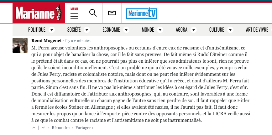 _ Tiens donc, voici le petit nazillon qui vient défendre son gourou avec ce petit papier de Marianne. Rappel, GP tient en effet des propos taxant les anthroposophes de racistes, antisémites…