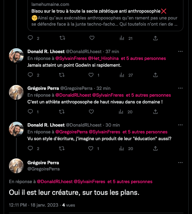 Il reste anonyme sur Twitter pour m’injurier publiquement, me traitant d’antisémite, …car depuis tout jeune, ce connard fini à la pisse, se frotte vicieusement aux dames et aux filles dans les transports en commun. C’est souvent comme cela que la néo zététique recrute. Il vient défendre et raconter des conneries en espérant une caresse de son maitre Grégoire, un vrai clebs.