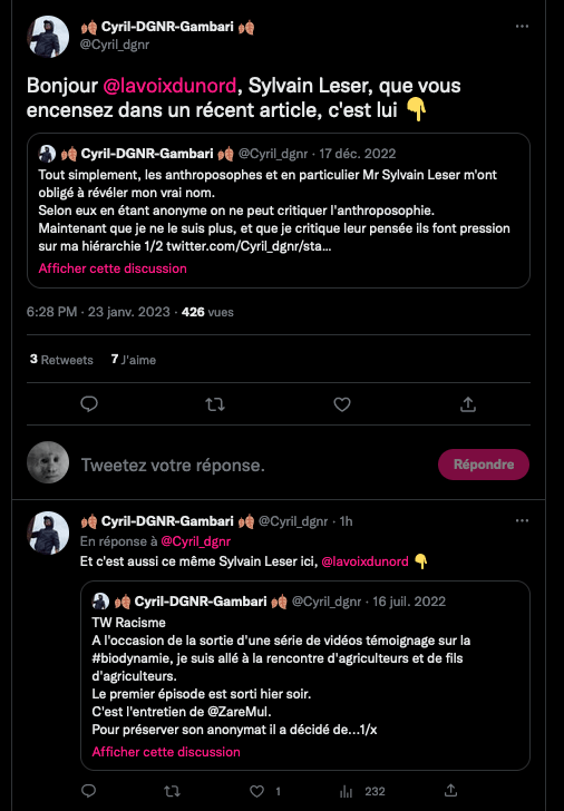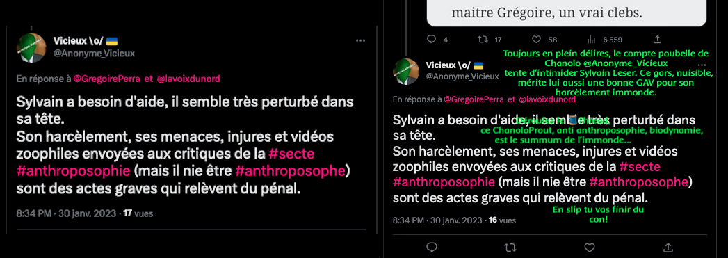 🩲Le type se fait appeler Anonyme Vicieux, il tente d’intimider Sylvain Leser qui défend l’anthroposophie, la biodynamie, etc. Derrière cet infâme compte poubelle se cache ChanoloProut, un p’tit truand du web🧵