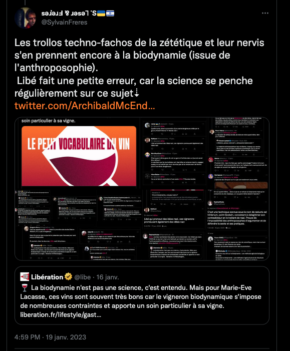 _ Les trollos Z souhaitent-ils que je reparle de biodynamie (issue de l’anthroposophie)?https://twitter.com/SylvainFreres/status/1616130234662944768?s=20&t=T1kn_c3D2sw8RADVUQpIoA