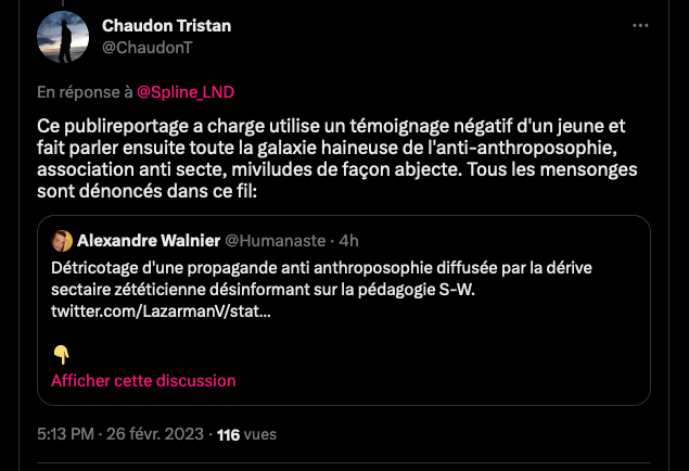 1/2 La façon dont c’est monté, c’est crescendo à charge sans contradiction aucune, si ce n’est le communiqué, mal placé. Le témoignage de GP, fallacieux comme d’hab, celui de Léo, plus frais, est chargé de ressentiment. Le tout 👇🏽Le tout est un remake un peu mieux fait mais malheureusement aussi morbide que toute la propagande noire chargée que je vois grimper depuis trois années que j’observe ce manège musclé anti anthroposophie. Le but étant de la dégommer violement, alors qu’elle est plutôt cool. https://twitter.com/LazarmanV/status/1630334727294009344?s=20 & https://twitter.com/LazarmanV/status/1630333982897258503?s=20 …
