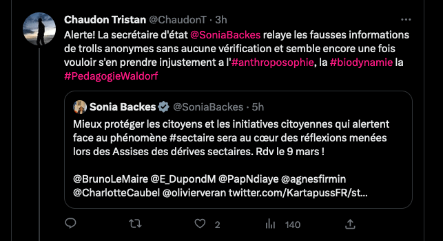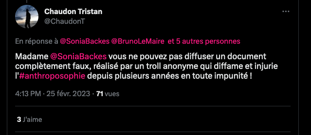 _Madame la secrétaire d’État retweet (sans doute par erreur) un troll agressif de la (secte) zététique qui n’a cesse de diffamer & harceler les anthroposophes & l’anthroposophie avec des allégations pénibles. https://twitter.com/LazarmanT/status/1629485626251792384?s=20 & https://twitter.com/LazarmanT/status/1629486847293259777?s=20 & https://twitter.com/LazarmanT/status/1629487566364852227?s=20 & https://twitter.com/LazarmanT/status/1629487389495160833?s=20 & https://twitter.com/LazarmanT/status/1629513504561438723?s=20 & https://twitter.com/LazarmanT/status/1629515005711319044?s=20 & https://twitter.com/LazarmanT/status/1629538631135182848?s=20 &