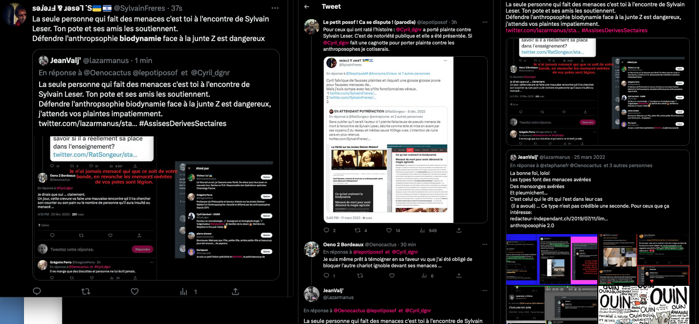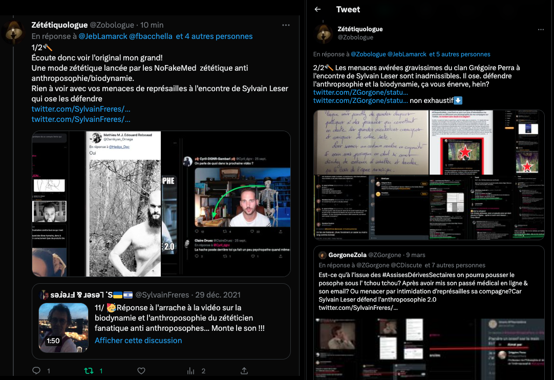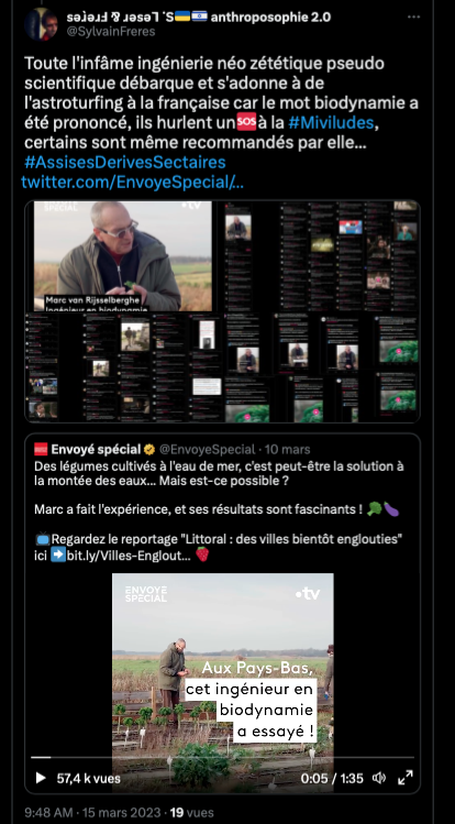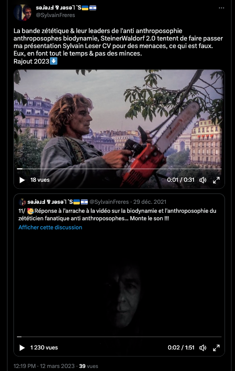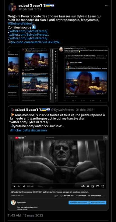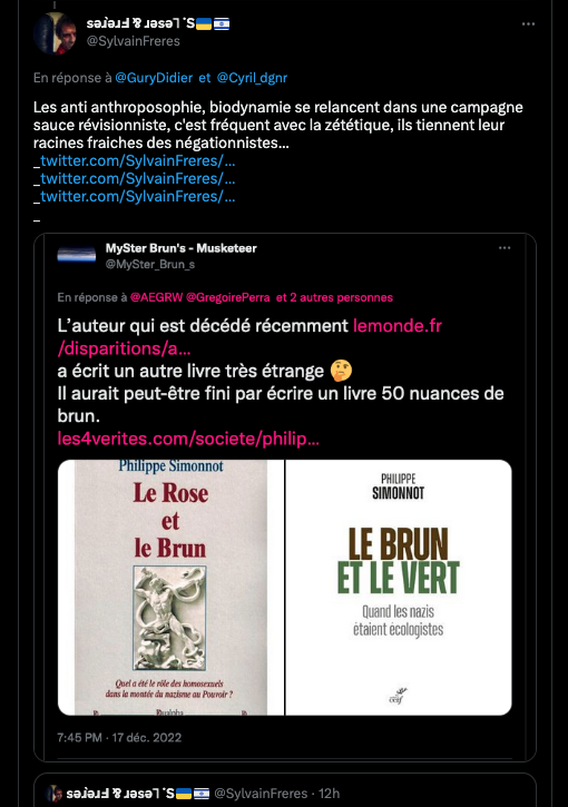 https://twitter.com/SylvainFreres/status/1476643242825367554?s=20 : https://twitter.com/RatSongeur/status/1632312867180490753?s=20 _Les activistes anti anthroposophie, biodynamie de la zététique, comme leur précurseurs révisionnistes négationnistes fabriquent de la fumée noire bien dégueulasse. Ces types enseignent, ça pue… :https://twitter.com/SylvainFreres/status/1632314118727249926?s=20