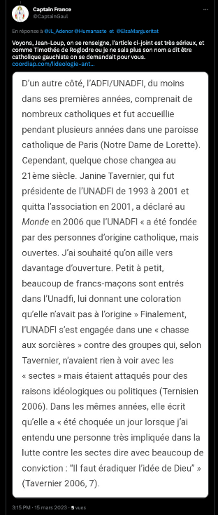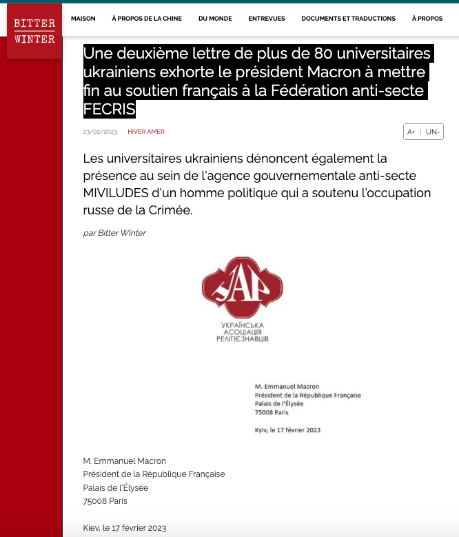 _Une presse rebelle, bien sûr, mais pas assez pour citer les organisations Internationales de défense de la liberté de conscience. Le débat a ses limites. https://twitter.com/CaptainGaul/status/1636000573504757760?s=20 & https://twitter.com/CaptainGaul/status/1635598706392088577?s=20 : https://freedomofconscience.eu/freedom-of-religion-from-the-uscirf-report-on-persecutions-in-russia-to-violations-in-europe-fecris-is-almost-entirely-financed-by-the-french-state-gongo-or-ngo/ etc.