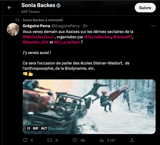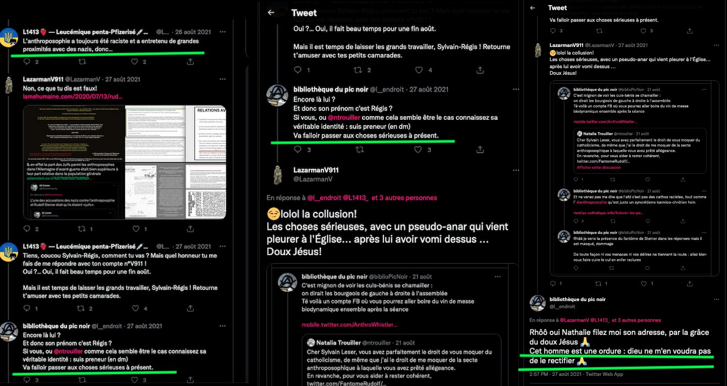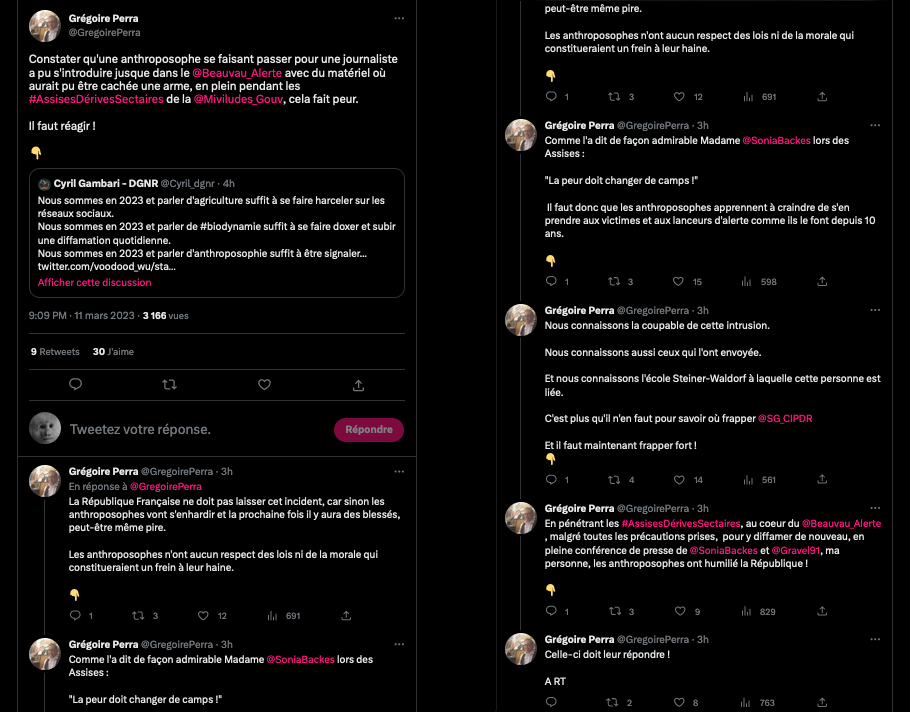 Les collusions sont évidentes. L’anthroposophie et ses fruits vont s’en prendre plein la gueule, pour pas un rond. Ceux qui ont décidé de la dégommer ne reculent devant rien. J’ai reçu des menaces gravissimes et récurrentes pour le simple fait d’oser défendre celle-ci, ils les ont vues, lues mais n’en ont rien à cirer. C’est la première fois que des membres du gouvernement de cet acabit s’en prennent ouvertement à cette entité, la main dans la main avec les pires trollos de l’internet Twitter, les mettant même en avant. Ces pseudos-assises dérives sectaires qui débarquent en puissance sont un sketch monumental ! J’espère juste que certains journalistes du genre Mediapart ou le Canard vont s’en saisir, car dans ce cas, c’est gros.
