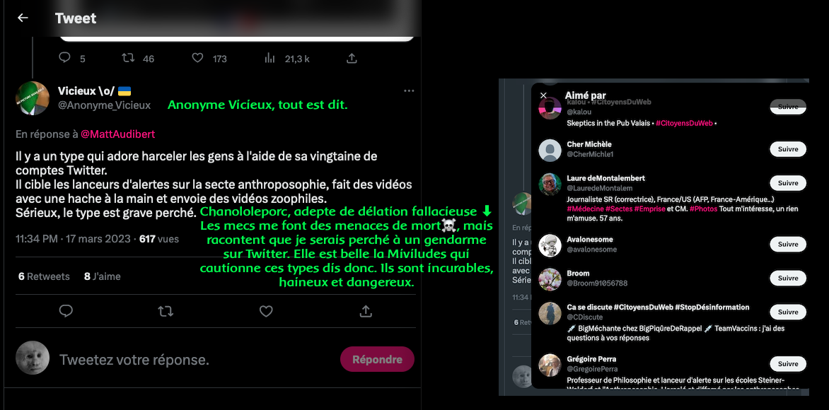 Les mecs me font des menaces de mort mais racontent que je serais perché à un gendarme sur Twitter. Elle est belle la Miviludes qui cautionne ces types dis donc. Ils sont incurables, haineux et dangereux.