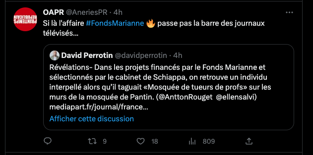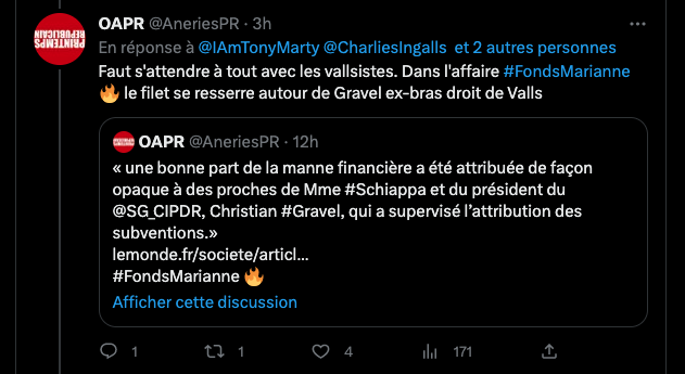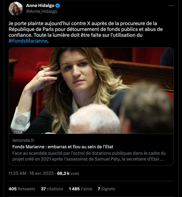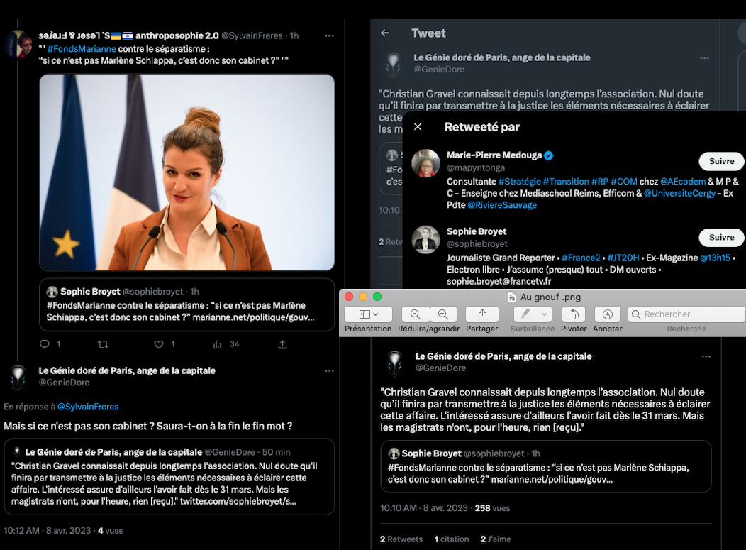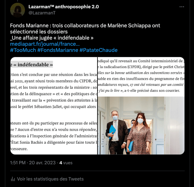 _« Une part substantielle du #FondsMariannea été distribuée de façon opaque à des proches de Marlène #Schiappa et de Christian #Gravel (dont nombre de sympathisants du #Printempsrépublicain), qui ont assuré la supervision de l’attribution des subventions.» https://twitter.com/AneriesPR/status/1645818182471503873?s=20