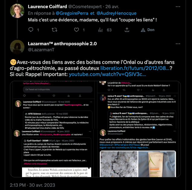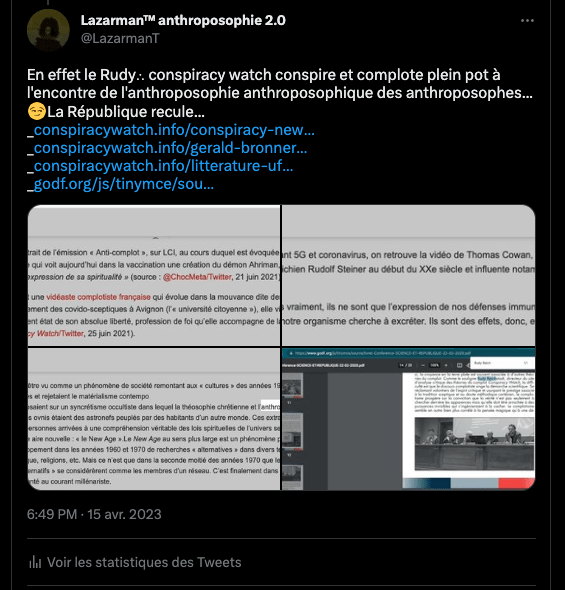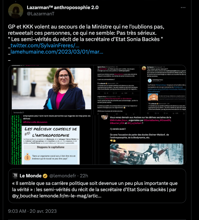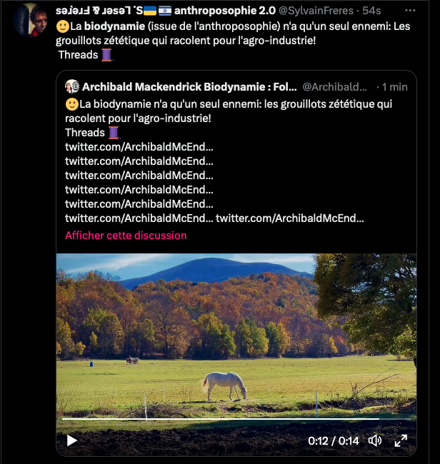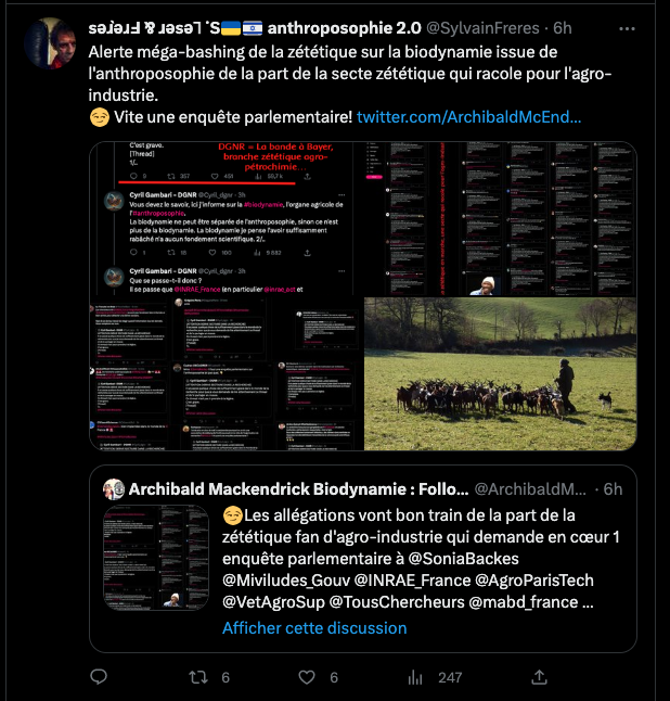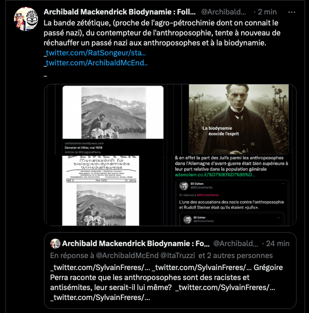 ll faudrait dire à votre pote Yann Duroc d’arrêter de raconter des et de laisser dire des horreurs sur la biodynamie et les anthroposophes, merci Mac. _https://twitter.com/SylvainFreres/status/1508888624699424779?s=20… _https://twitter.com/ArchibaldMcEnd/status/1648713082162536449?s=20… _https://twitter.com/ArchibaldMcEnd/status/1648713198600593408?s=20… _ https://twitter.com/ArchibaldMcEnd/status/1648712896803684352?s=20 : https://twitter.com/ArchibaldMcEnd/status/1648716424276324355?s=20