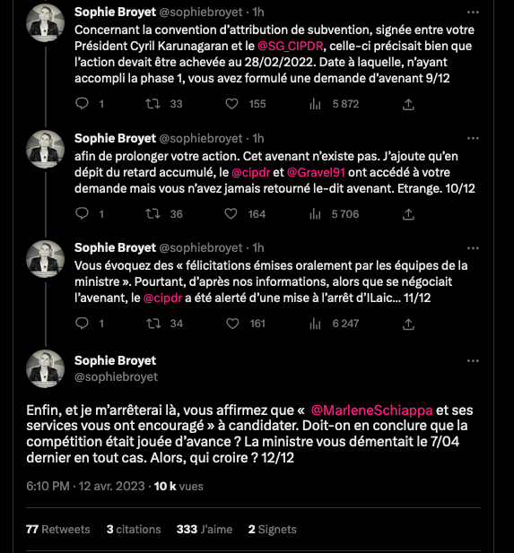 _ 🧵https://twitter.com/sophiebroyet/status/1646183883451269121?s=20 & https://twitter.com/sophiebroyet/status/1646148850141331460?s=20 Enfin, et je m’arrêterai là, vous affirmez que « @MarleneSchiappa et ses services vous ont encouragé » à candidater. Doit-on en conclure que la compétition était jouée d’avance ? La ministre vous démentait le 7/04 dernier en tout cas. Alors, qui croire ? 12/12 https://twitter.com/sophiebroyet/status/1646183904615833602?s=20