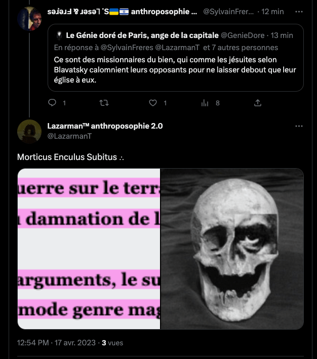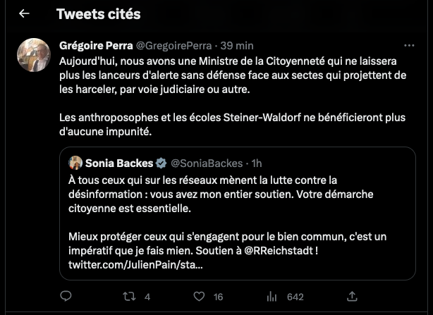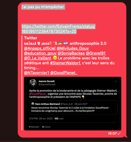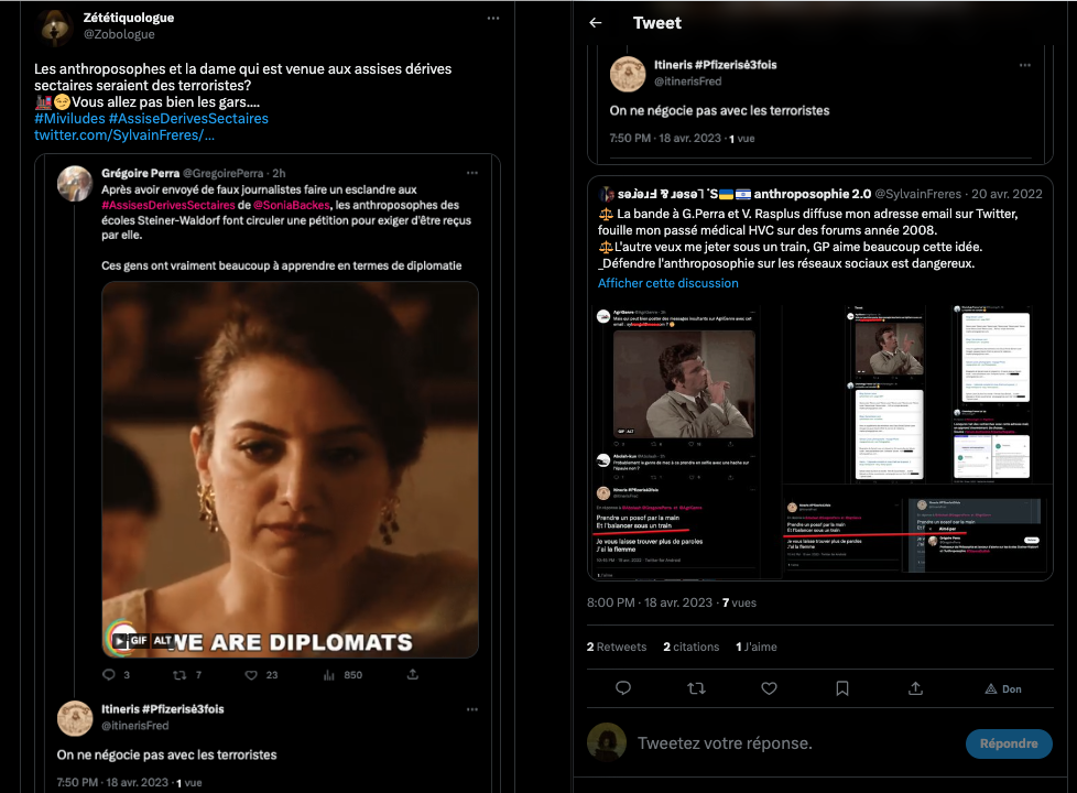 . Un camarade Twitter de Grégoire Perra traite les anthroposophes de terroristes, c’est d’ailleurs celui qui veut les pousser sous un train, et GP aime l’idée. #Miviludes #AssisesDerivesSectaires https://twitter.com/AnthroposopheW/status/1648394020844871688?s=20 & https://twitter.com/FantomeRudolf/status/1648394401507319812?s=20
