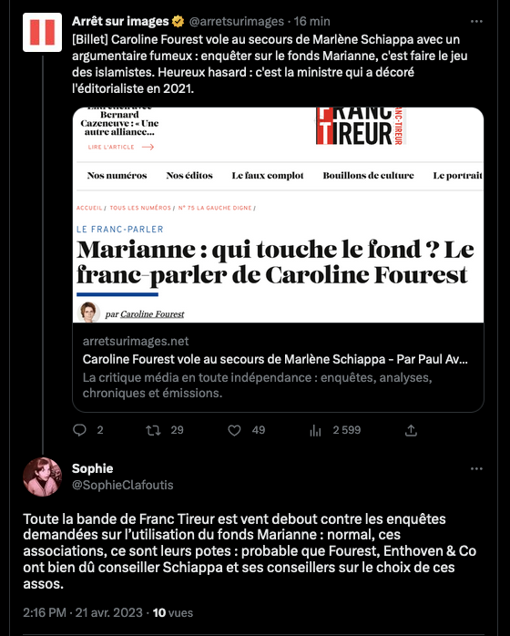 _Les questions auxquelles elle ne veut pas répondre hormis son baratin récent. https://twitter.com/LazarmanT/status/1651946575566872579?s=20 & https://www.marianne.net/politique/gouvernement/apres-playboy-schiappa-la-chipie-fait-la-couv-de-causeur-et-se-derobe-sur-le-fonds-marianne