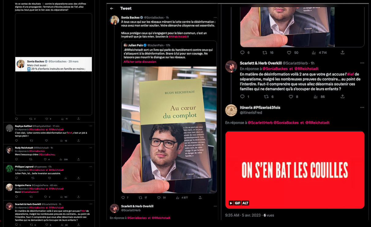 ___ Je vais laisser pisser la « légitime défense frontale » pour l’instant, si cette ministre, fan d’informatique et de zététique, aime et QRT ces types, c’est son problème …(et celui des anthroposophes). Même si elle cautionne des dingues en ligne, lui remettre sous le nez leur menaces va l’énerver et re-capter l’attention, ce qui serait un peu de boulot et une bonne cinquantaine de tweets à faire, j’attends donc de voir si ces abrutis continuent d’arrêter de me mentionner… et surveiller cela, tranquillement… Tout ce qui est marqué sur la couverture du bouquin de Reichstadt, j’en suis victime, j’ai toutes les preuves, elles sont en partie ici sur ces pages de blog, la bande à Perra le sait, c’est eux qui le font. L’accusation inversée et les contrevérités, ils en usent et en abusent… Ils ne me font pas vraiment peur, la plus part sont des trollos anonymes, des sacs à merde haineux, c’est juste que c’est chronophage et circulaire et n’étant pas anthroposophe, c’est d’ailleurs plus à eux mêmes de se défendre…
