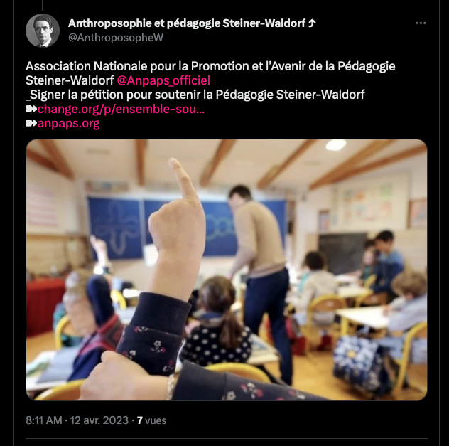 L’ANPAPS (Association Nationale pour la Promotion et l’Avenir de la Pédagogie Steiner-Waldorf) demande à être reçue par la secrétaire d’État à la Citoyenneté pour que le prochain rapport soit enfin conforme à la réalité des écoles Waldorf.