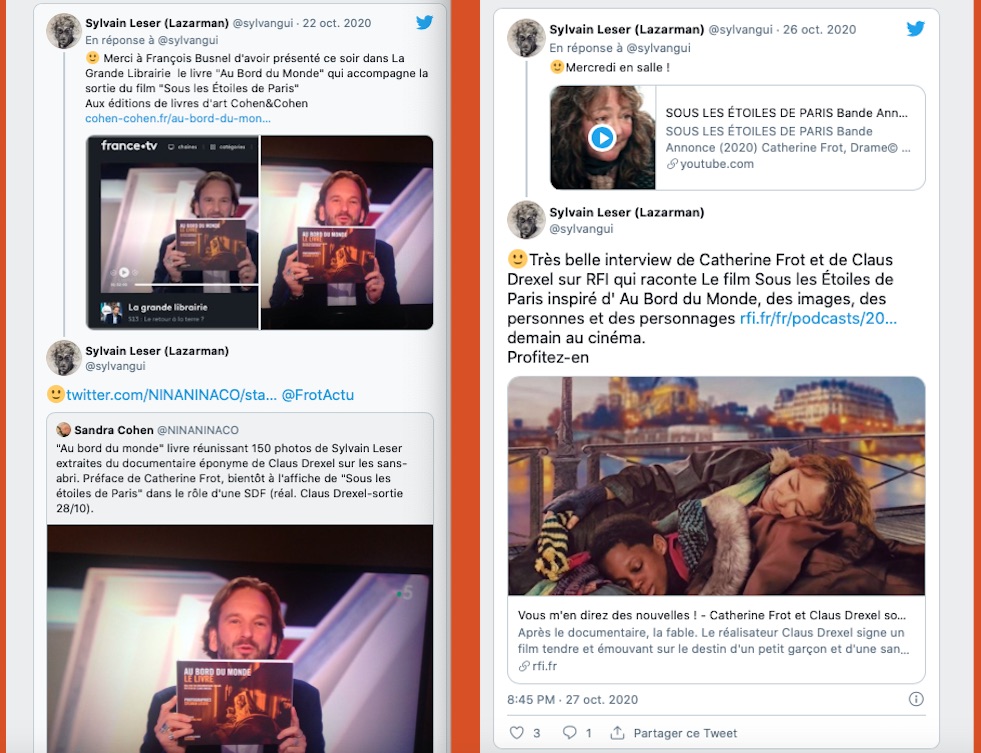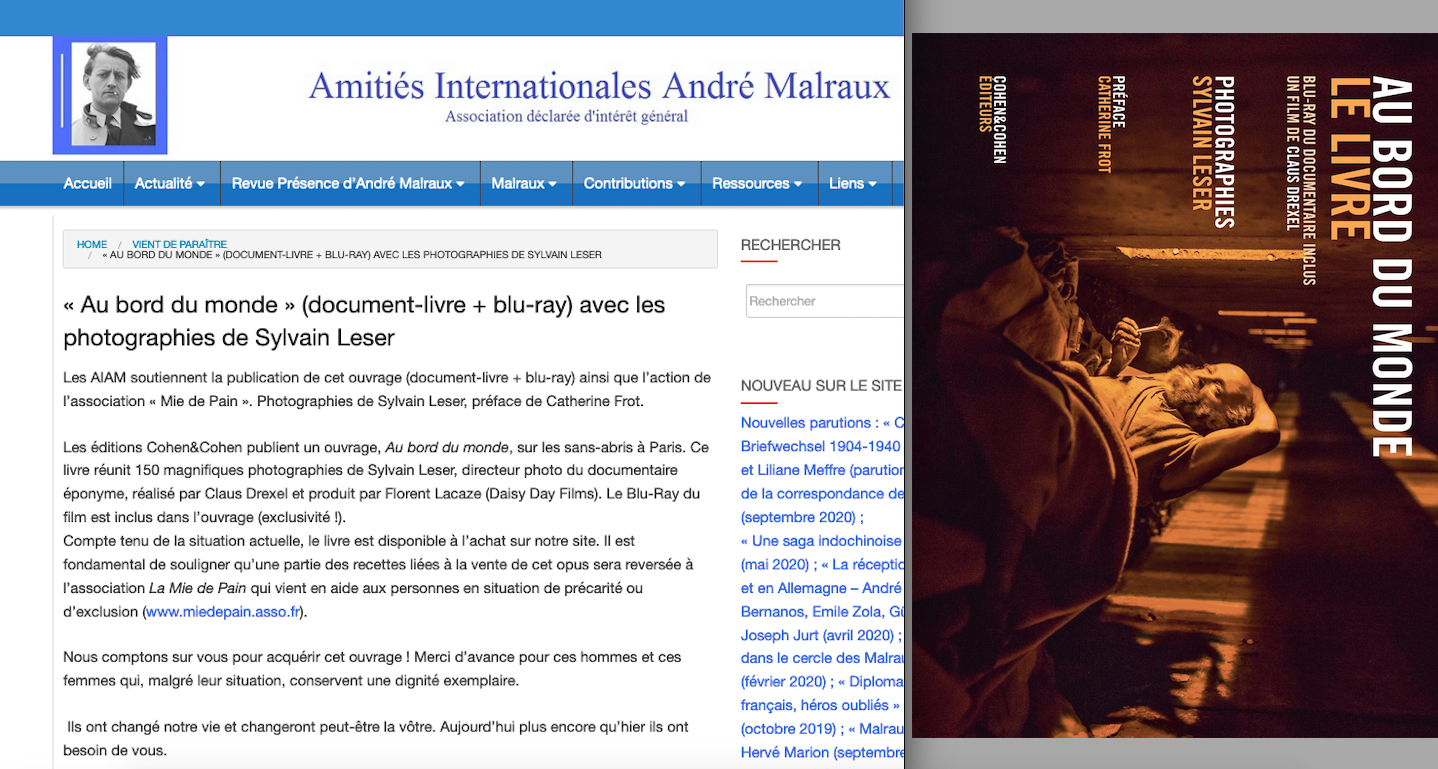 Le film-documentaire « Au bord du monde » rĂ©alisĂ© par Claus Drexel, directeur de la photo Sylvain Leser a inspirĂ© le long-mĂ©trage « Sous les Ă©toiles de Paris ». Tout comme Catherine Frot, avoir vu « Au bord du monde » a bouleversĂ© notre vie ! Un livre rĂ©unissant 150 photographies de Sylvain Leser, extraites du documentaire, est Ă paraĂźtre fin mars chez Cohen&Cohen. Le Blu-Ray du documentaire sera joint au livre (Daisy Day Films) . Une partie des bĂ©nĂ©fices sera reversĂ©e Ă l’association « La Mie de pain » : https://www.miedepain.asso.fr.