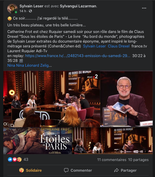 Catherine Frot est chez Ruquier samedi soir pour son rĂŽle dans le film de Claus Drexel « Sous les Ă©toiles de Paris » – Le livre « Au bord du monde », photographies de Sylvain Leser extraites du documentaire Ă©ponyme, ayant inspirĂ© le long-mĂ©trage sera prĂ©sentĂ© (Cohen&Cohen Ă©d) Sylvain Leser Claus Drexel france.tv Laurent Ruquier Adl-Tv