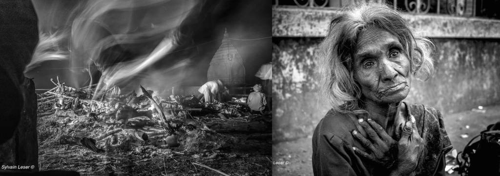 Encore un mort dont on prend soin avec ferveur et la souffrance dâun homme comblĂ© de malheur. Ce n’est pas vraiment important de savoir si le noir et blanc sont des couleurs.La palette des gris est riche en profondeur et ça limite l’horreur. Ă Manikarnika, lorsque le Ganges a bĂ©nĂ©ficiĂ© des eaux de pluies de mousson puis de la fonte estivale des glaces en Himalaya, le fleuve dĂ©bite toute sa puissance. Il rĂ©duit lâespace oĂč deux cents corps seront quotidiennement brulĂ©s. Cette promiscuitĂ© rend ce lieu, bien plus chaleureux. Babu un jeune de dix-sept ans me raconte que sa mĂšre a Ă©tĂ© incinĂ©rĂ©e ici lorsquâil avait onze ans, depuis ce jour, il fait partie du clan.Les temples des rives de la citĂ© sont complĂštement immergĂ©s plusieurs mois par an. Le feu qui ne sâĂ©teint jamais nâest donc pas celui quâon vous montre dâune façon rassurante. Un soir Madan, que je suis partout et qui possĂšde toutes les clefs du site, nous fait traverser, une grotte encavĂ©e Ă flanc de colline oĂč se trouve la sauvegarde principale de cette flamme Ă©ternelle. Les hindous sâintĂ©ressent Ă leur propre histoire dâune façon trĂšs diffĂ©rente de la nĂŽtre, ils sont bien trop occupĂ©s Ă rembourser aux dieux leur viscĂ©rale dette karmique.La vache mythique et bĂ©nite, Ă coup de bouse, enrichit les sols et fournit le lait durant de son passage sur terre. On sait bien ici que ce sont les Anglais qui ont tirĂ© les premiers, leur point de vue sur l’histoire nâest que rationnel, chez eux il reste de spirituel le foot, la saucisse et la reine. Jâen vois passer Ă la pelle des conneries sur les bovins qui dĂ©truiront soi-disant la planĂšte en pĂ©tant du mĂ©thane et dont le nectar serait du poison !La sentence comme quoi c’est scientifique me fait halluciner. Quand tâentend dans ta caisse, coincĂ© dans les bouchons industriels Ă la pĂ©riphĂ©rie des villes plombĂ©es d’un truc quasi radioactif, le mec de la mĂ©tĂ©o qui se gaufre sur les ondes en confondant brume matinale et pic de pollution. Moi je te dis que dans 50 ans ta trouvaille sera une lĂ©gende et quâil faut arrĂȘter net de mettre des hublots sur Marguerite et que comme dâhab, si tu n’a rien Ă dire que je ne sais dĂ©jĂ ce serait bien que tu mouftes pas. C’est agrĂ©able de faire de longue tirade sous des photographies, le noir est blanc attire l’Ćil et le cerveau dâun coup d’un seul. Pourtant nous ne voyons pas, ne rĂȘvons pas et ne pensons pas en Black & White c’est une tromperie que vous allez pourtant savourer.Ce type que jâai approchĂ© au grand angle a une vie de merde.Je ne connais pas son prĂ©nom, la lĂšpre lâempĂȘche de parler. Sâest-il pĂ©tĂ© la face au gaz butane, lui a-t-on renversĂ© de l’acide de batterie dessus ou tout ça et bien plus encore Ă la fois. Ici les ĂȘtres dĂ©figurĂ©s ne se cachent pas, en effet me dira-t-on dâune rĂ©plique tout faite- ĂȘtre mendiant lĂ -bas c’est un mĂ©tier ! Bah, alors voilĂ , ce jour-lĂ j’ai eu la chance de rencontrer l’employĂ© du mois. Je ne sais toujours pas ce quâil pense, certes il sera nourri et sucera des chappattis. Il gagne maximum 10 roupies par jour, je regarde dans deux secondes le cours de la bourse et on fera les comptes.Tout ça fait beaucoup de violence d’un coup, je me rappelle que j’avais pris une prune de 250 roupies Ă 250 mĂštres de lĂ parce que je fumais une clope dans la rue, aux abords dâun Ă©difice religieux trĂšs somptueux, la mosquĂ©e Haji Ali Dargah.5 euros lĂ -bas c’est Ă©norme et ça peut crĂ©er un ameutement, 10 roupies, personne ne bouge.(ps) y a un type en maillot de bain au milieu des bĂ»chers..