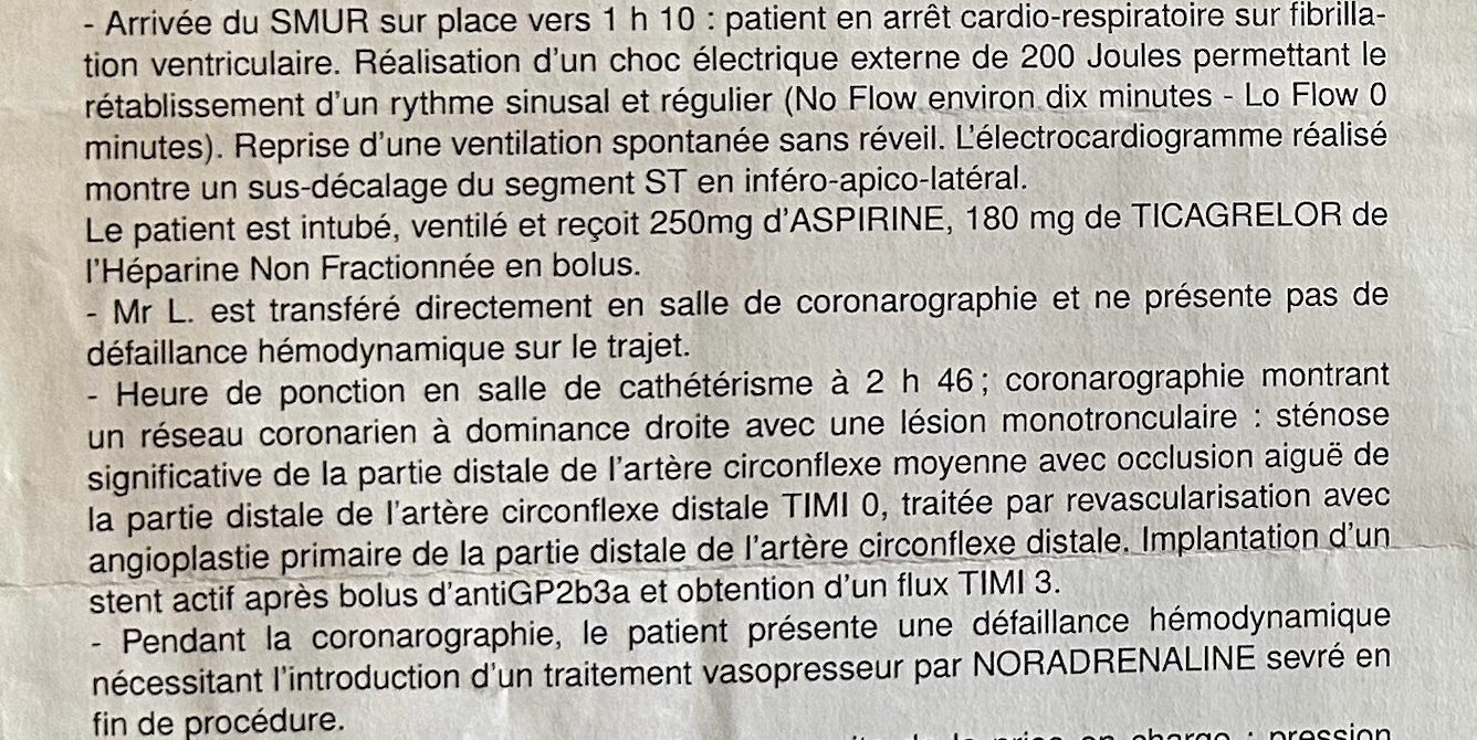Je sortais dâun vernissage avec un passage dans les tunnels du pĂ©riph pour voir le Henri, et suis rentrĂ©. Vers 23h, j’ai commencĂ© Ă faire un infarctus puis dans la foulĂ©e un arrĂȘt cardiaque et respiratoire (ACR) aux alentours de minuit. JâĂ©tais en ligne avec le Samu et jâai Ă©tĂ© pris en charge minimum 20 mn plus tard par les secours, avec un NowFlow environ Ă 10 minutes… (LowFlow 0 mn).