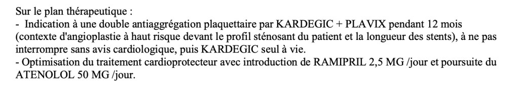 ponction de cathĂ©-central et artĂ©riel avec souffle systolique Ă l’auscultation et dĂ©globulisation jusqu’Ă 10 g/dl d’hĂ©moglobine Ă la biologie..âą Double anti agrĂ©gation plaquettaire pour une durĂ©e d’un an âą Clopidogrel..Introduction d’un traitement par Statine..et BĂȘtabloquant..Ă vie. âŁ