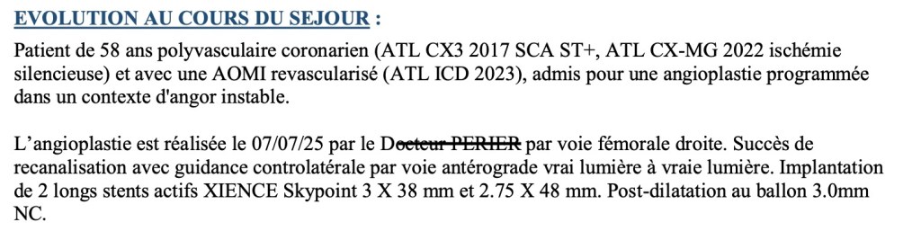 Heure du « dĂ©cĂšs » {mort subite, perte de conscience et arrĂȘt-cardio-respiratoire juste avant 01:00 du mat}: le 19 janvier 2017. (j’aimerai bien rĂ©cupĂ©rer l’appel au SAMU mais cela coute une blinde) OpĂ©rĂ© en salle de cathĂ© vers 3h, puis mise hypothermie aprĂšs divers gros bricolages. RĂ©surrection complĂšte le 22 janvier 2017. suivi en USIC ‘RĂ©animation’, mais du 19 au 21 GLASGOW 3 max, rĂ©veil complet surprise, je ne m’en souviens pas..-Le cerveau se prend une Ă©norme baffe dit-on -..’Bis Repetita’..