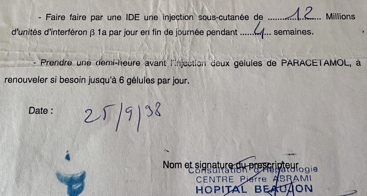 Je me rappelle maintenant dâun essaie costaud dont jâavais bĂ©nĂ©ficiĂ© en 1998 chez les champions du foie, pavillon Ămile-Sergent Ă Beaujon. Du Rebif â pour les virus qui se rebiffent â Ă haute dose, sâil vous plaĂźt. Les toubibs, deux ce jour-lĂ , mâavaient demandĂ© de tirer au sort lâune des quatre enveloppes pour cette Ă©tude randomisĂ©e, quantitative et qualitative. La mienne, selon mon hĂ©patologue, se situait juste en dessous de la plus lourde. Câest ainsi que je suis devenu, aprĂšs signature de multiples dĂ©charges de non-responsabilitĂ© â au vu de ma maladie incurable et mortelle â un cobaye humain. Je me suis donc injectĂ© chaque jour, pendant quarante-neuf semaines il me semble, de lâinterfĂ©ron-bĂȘta-humain, 12 ÎŒg B1a, reconditionnĂ© en gĂ©nie gĂ©nĂ©tique, pour tenter de me dĂ©barrasser de mon VHC activement chronicisant gĂ©notype 1(1a). Ă lâĂ©poque, je nâen Ă©tais quâau stade 2 de la fibrose. Je remplissais chaque jour mon cahier dâeffets secondaires. JâĂ©tais gris. Je fixais le plafond en dĂ©pression totale. Jâattendais que ma compagne rentre du travail le soir pour me faire mon cafĂ© du matin, la nuit. Tous les quinze jours, je prenais un taxi â remboursĂ© par le laboratoire â pour aller faire des prises de sang, ECG, Ă©chographies, etc. Un jour, lâinfirmiĂšre â je me souviens trĂšs bien de son regard effrayĂ© â me dit: « Câest la premiĂšre fois que je vois ça. » Le sang qui sortait de mes veines Ă©tait noir.