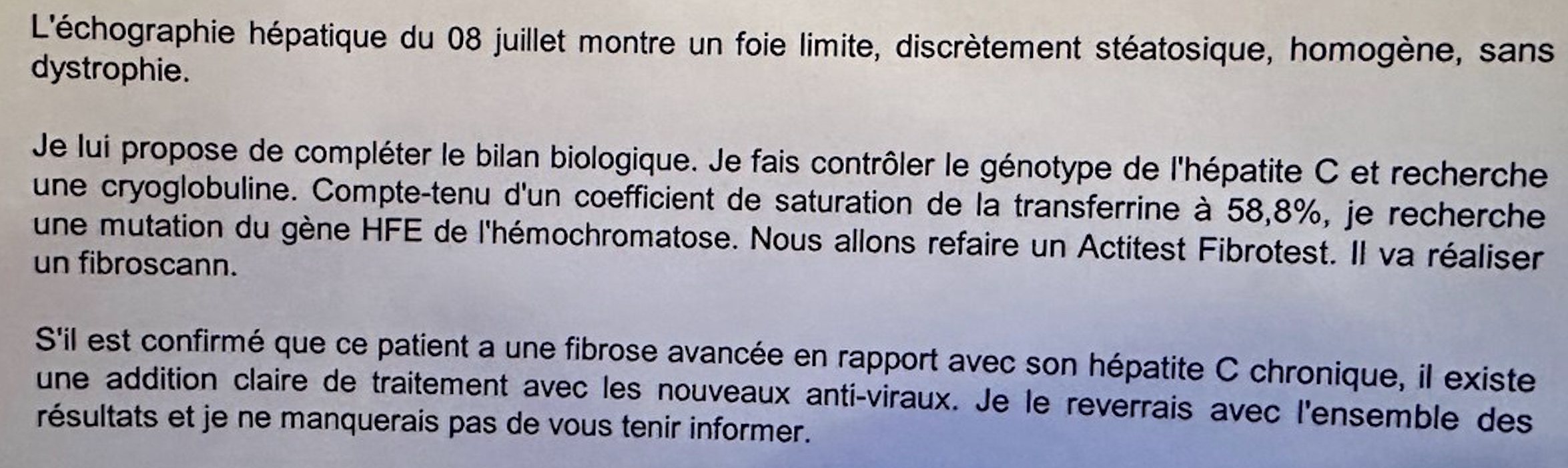 Une problĂ©matique Ă©mergente. Si les hĂ©patologues sont concentrĂ©s sur la guĂ©rison des malades, qui doit s’occuper de l’aprĂšs guĂ©rison: les spĂ©cialistesâ? Le mĂ©decin gĂ©nĂ©ralisteâ? « C’est une rĂ©flexion qu’il va falloir mener sur l’organisation de notre systĂšme de santĂ© et sur la cohĂ©rence de notre filiĂšre », estime le Dr MĂ©lin. Les malades de l’hĂ©patite C vivent actuellement une situation exceptionnelle: ils sont les premiers patients de l’histoire de la mĂ©decine guĂ©ris d’une pathologie chronique, {……………….. De mĂȘme il faut, selon lui, se mettre d’accord avec le patient qui doit comprendre qu’il ne sera dĂ©barrassĂ© que du virus. « S’il avait une cirrhose, le risque d’hĂ©patocarcinome est toujours prĂ©sent,…………}/.