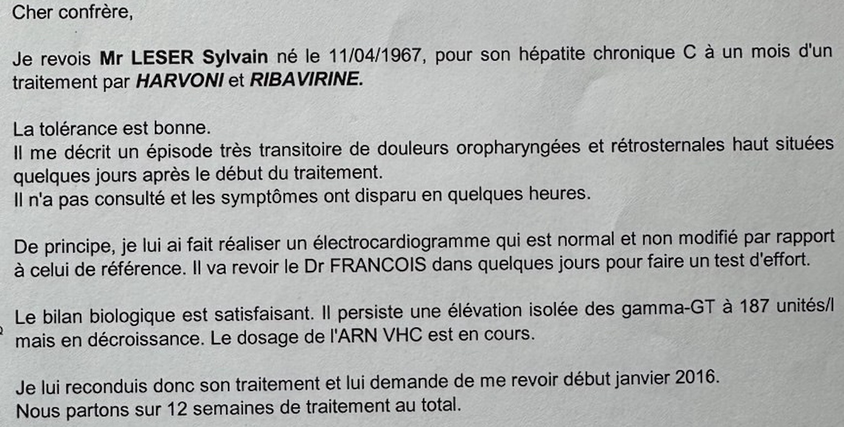 Je dĂ©bute donc, aprĂšs ces trois ou quatre mois dâhospitalisation dans plusieurs lieux, le fameux traitement, qui doit dâailleurs ĂȘtre suivi de prĂšs: examens rĂ©guliers, ECG, cardiologie⊠Il faut ĂȘtre prudent avec la Ribavirine.